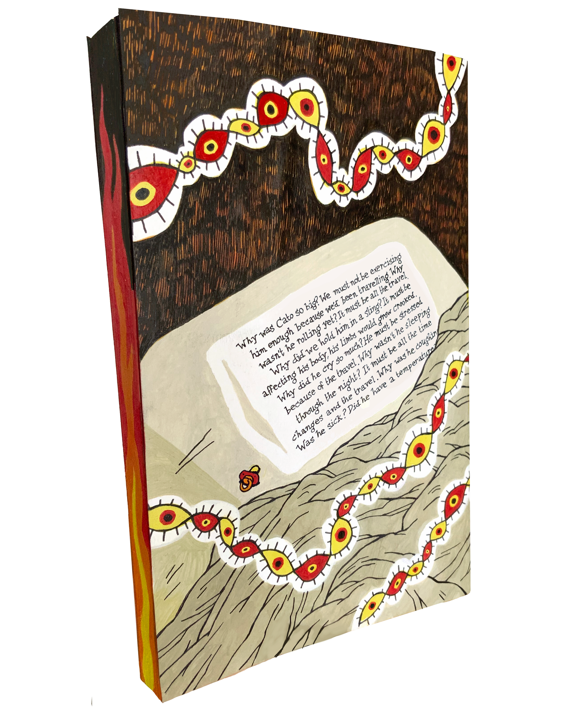 Met het ontwerpen van deze omslag (evenals mijn ontwerp voor The Awakening) ben ik gestart tijdens mijn residency bij Extrapool vorig jaar. Oorspronkelijk wilde ik dit ontwerp risoprinten, maar daar ben ik niet aan toegekomen. Nu heb ik met acrylverf toch eindelijk het boek afgemaakt!